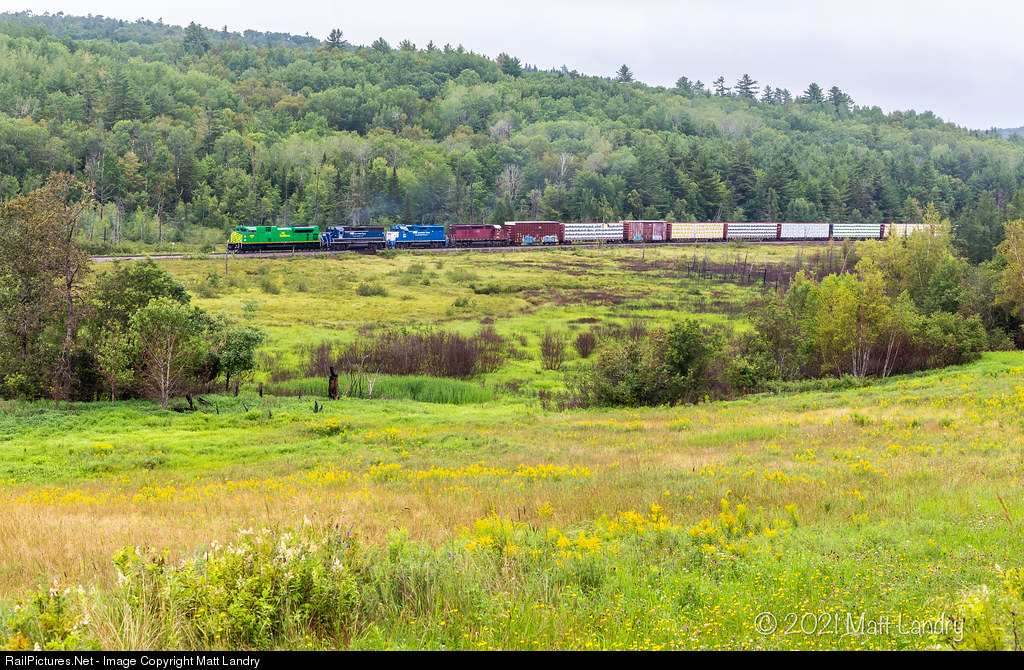 | Brand new used NBSR 6401, ex Norfolk Southern powers train 907 through the fields at Clarendon, New Brunswick. |