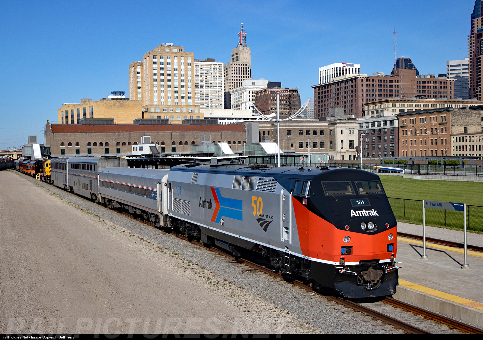 | Amtrak 161, in fresh 50th Anniversary paint, poses for photos at St. Paul Union Depot (SPUD) during Train Days 2021. |