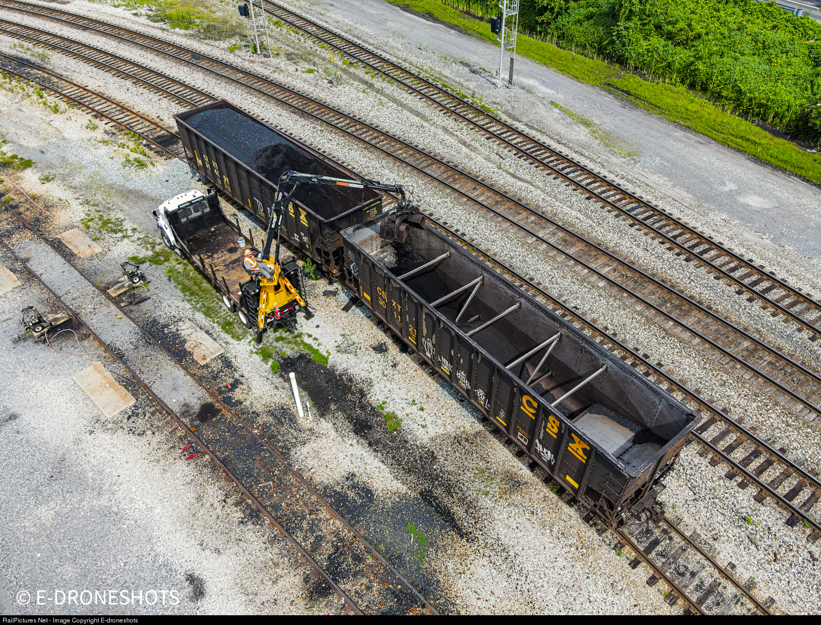 A contracted worker is seen transferring a coal load from one hopper to another as the bad order hopper has “burst” out on the underside of the body.