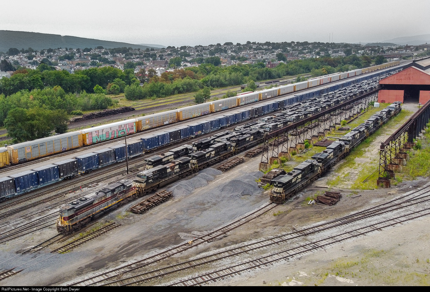 A birds-eye view of the locomotive storage lines at the Juniata shops, Norfolk Southern's biggest locomotive shop. Unfortunately, due to decreased freight traffic in conjunction with precision scheduled railroading, many locomotives are in temporary and long-term storage here. |