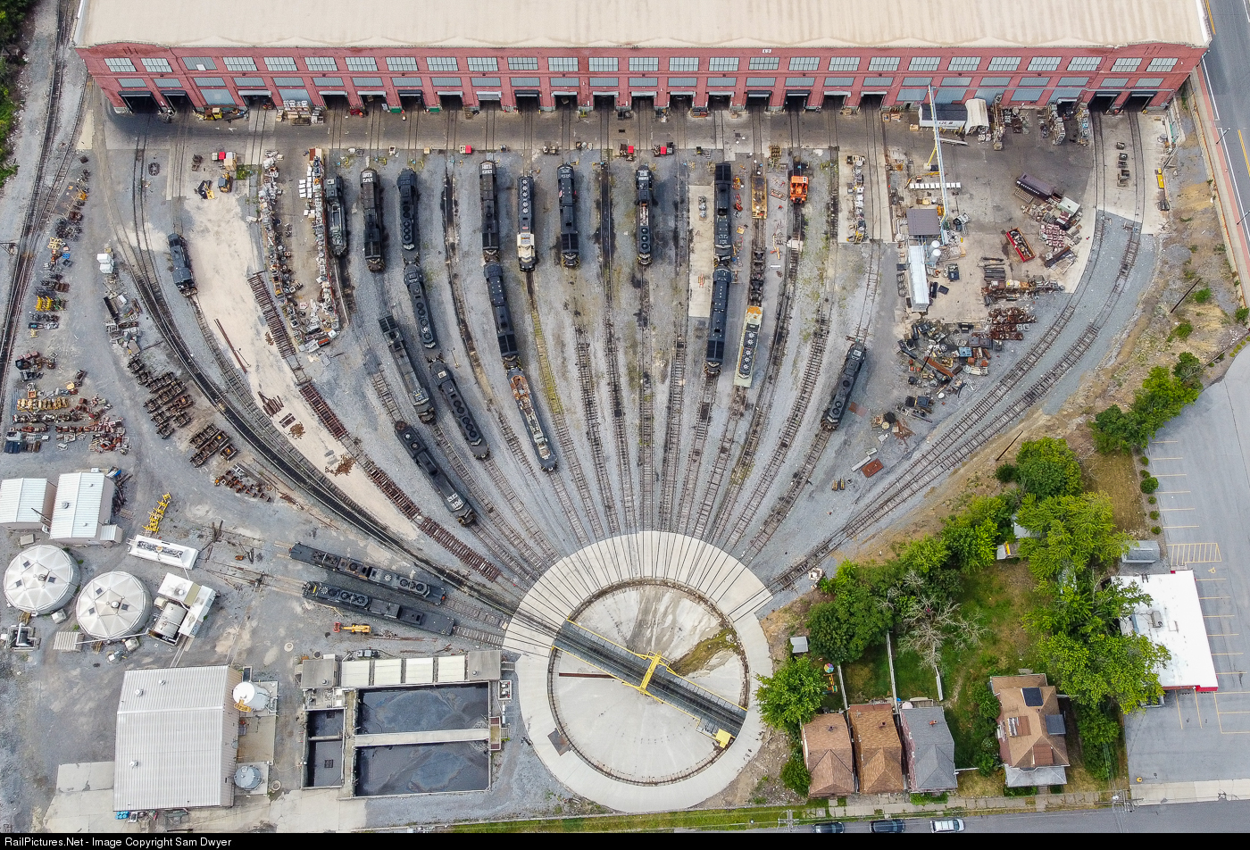 A bird's eye view of the turntable at Norfolk Southern's Juniata Shops in Altoona, PA.