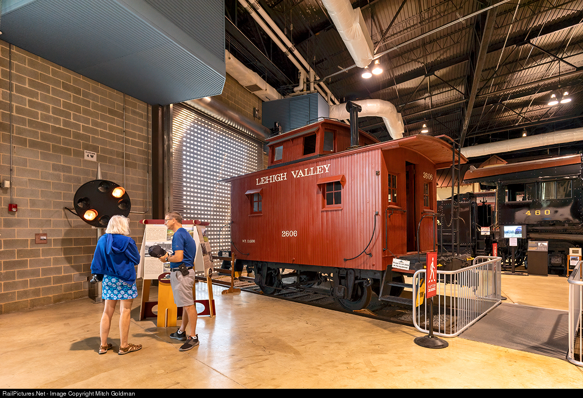 Lehigh Valley "Bobber" caboose - built around 1900 and retired from road service in 1937.Per the Museum's plaque: "The early history of this car remains clouded in uncertainty. Built by the Lehigh Valley Railroad in their Packerton Car Shops around 1900, the car served only a few years on the Black Diamond Route before being sold to the Williamsport and North Branch Railroad prior to World War I. In 1921, the car was sold to the C.W. Sones Logging Company in Nordmont, Pennsylvania. Shortly after the mill closed in the 1930s, the car was stripped of its wheels and used as a watchman's shanty, storage shed, and finally a playhouse for kids for many years as "Aunt Clara's Caboose". Mr. John Gummo of Lock Haven, Pennsylvania purchased the car in 1982 and began his own restoration. A new under frame was acquired from a former Lehigh and New England clearance car. The remainder of the car was rebuilt to its original Lehigh Valley appearance. The number 2606 was found on the walls inside the car during this restoration. No. 2606 is not the car's original Lehigh Valley number but probably dates to the Williamsport and North Branch. Mr. Gummo displayed the car on his farm until donating it to the museum in 1997."