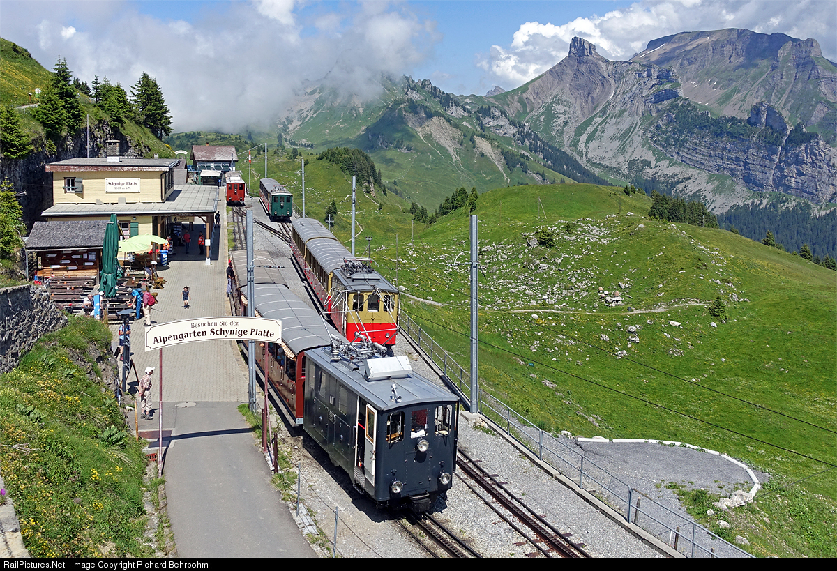 Coghweel locomotive He 2/2 11 (built by SLM and BBC in 1914) is leaving the top station Schynige Platte, 1967 metres (6453 ft) above sea level. Three more trains are waiting for passengers going back to Wilderswil. Line length is 7.26 km (4.51 mi), track gauge 800 mm (2.62 ft).
