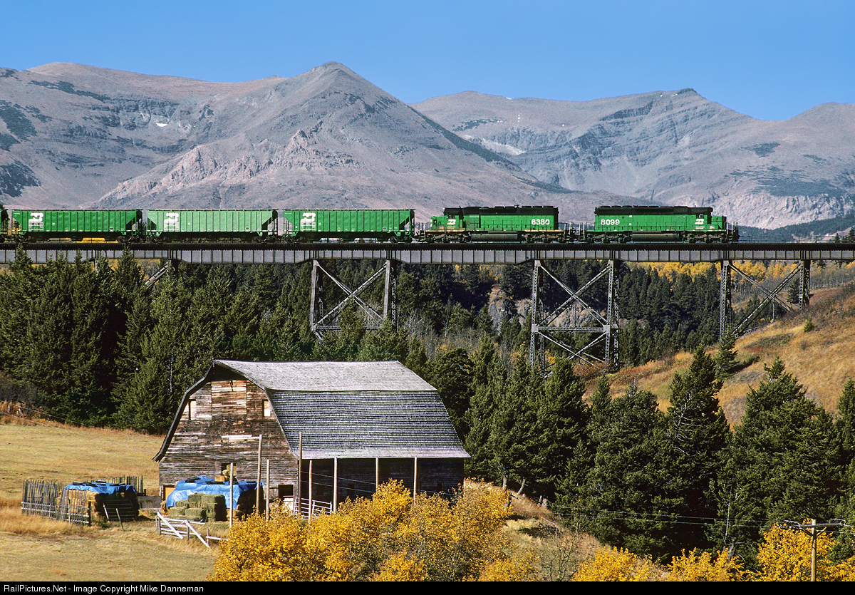 Two Burlington Northern EMD SD40-2 pusher locomotives give some help to westbound loaded grain train G05 as it crosses Two Medicine Bridge at East Glacier, Montana, on October 8, 1996. With five Cascade green locomotives leading, almost the entire train train was green, spoiled only by a couple of gray covered hoppers mixed in.