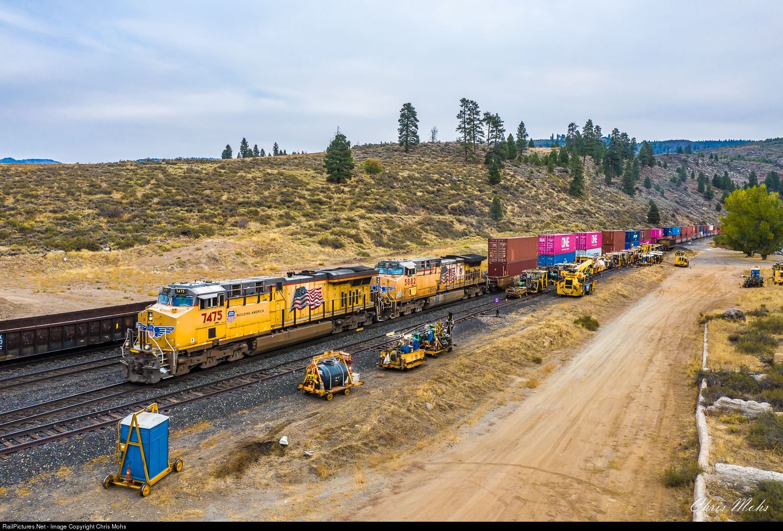 | Westbound stacks with Union Pacific ES44AC no. 7475 leading, passes by MOW equipment at the site of the old town of Boca. Founded as a lumber town to supply the building of the Central Pacific Railroad in 1868, it lasted untill1904 when the Hotel burned down. Foundations, Cemetery and a bridge are all that remain.