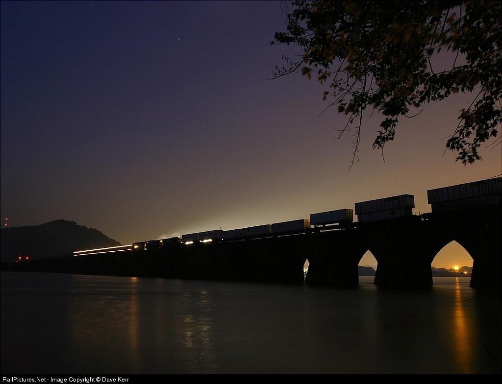 Eastbound intermodal 20Q waits on Rockville Bridge as a coal train from the Buffalo Line passes it heading for Enola. Canon 10D and 17-40mm lens, 64 second exposure af f8.0.