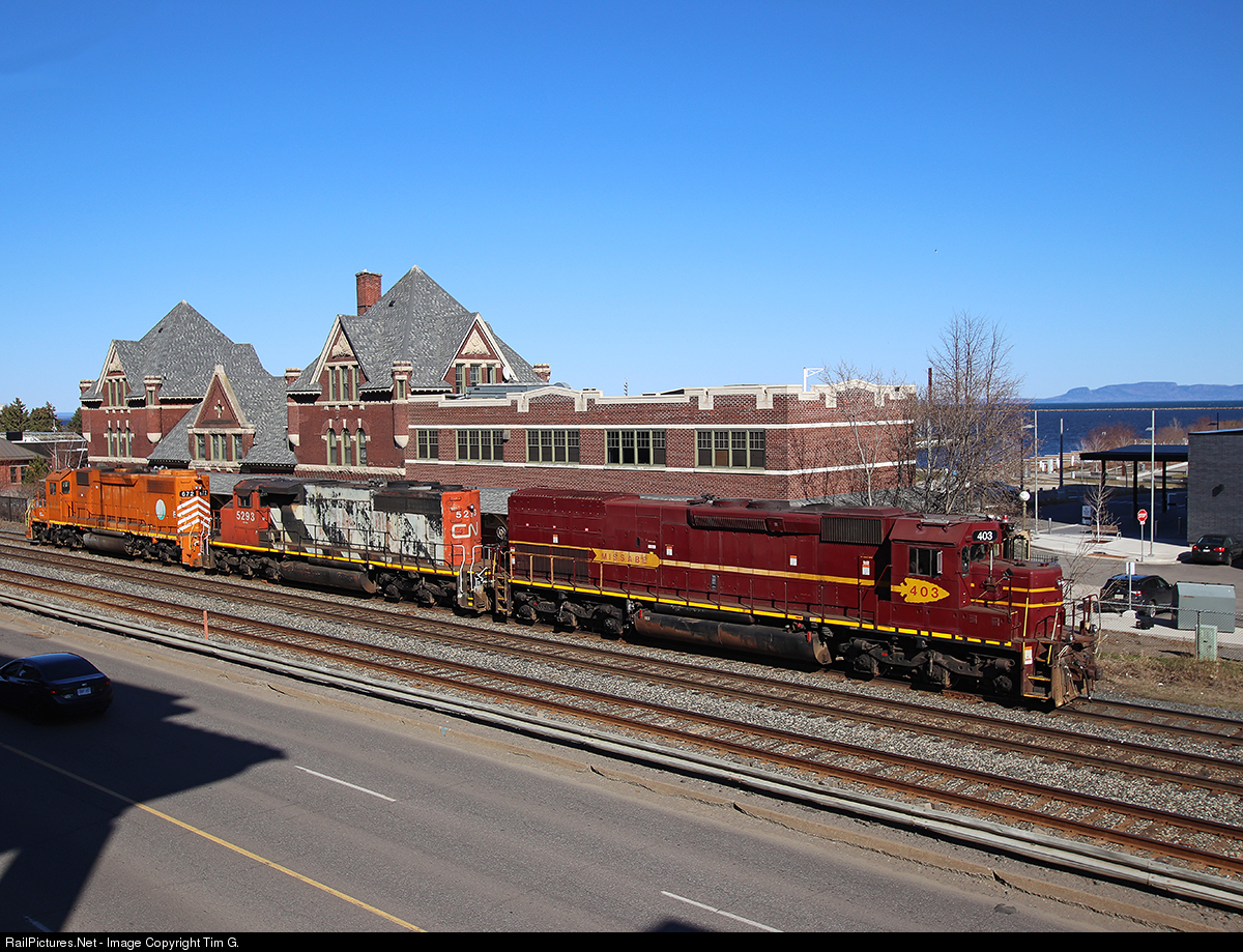| Backdropped by the CN station, the shores of Lake Superior/Thunder Bay marina, and the Sleeping Giant, the CN triple set heads light to current river to pull JRI/UGGA empties. The station originally built in 1906 by the Great Northern was purchased by the city in 1977 and deemed historical to be preserved. |
