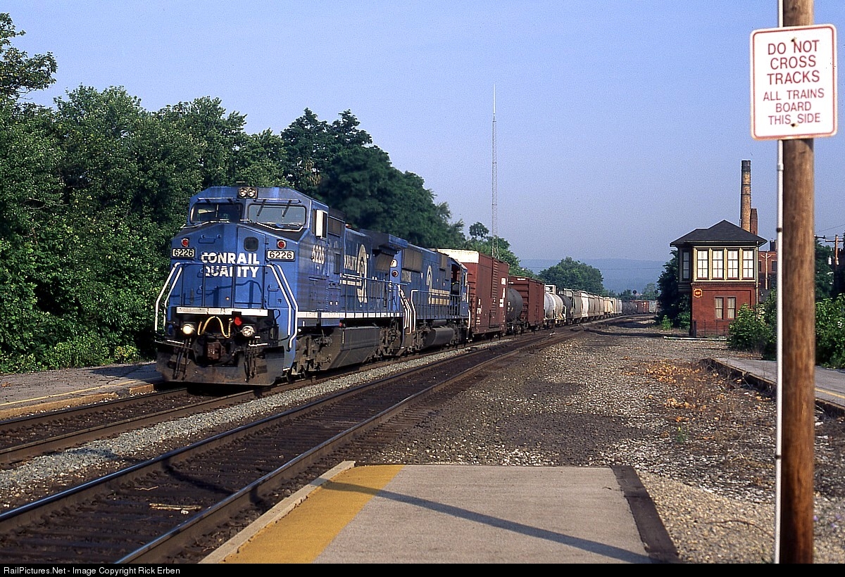 A bluebird July morning in Huntingdon, PA finds a C40-8W and an SD-60 in charge of an eastbound manifest making time down the Juniata River valley. This was highball territory and they really ripped through Huntingdon in CR days. Some 8-12 manifests in each direction traversed the Pittsburgh line at this time, plus trailvans and mineral freight. The vintage 1900 interlocking station was manned until 1985 when the multiple track mainline was reduced to two main tracks and the familiar towers located about every twenty miles along the route were closed.