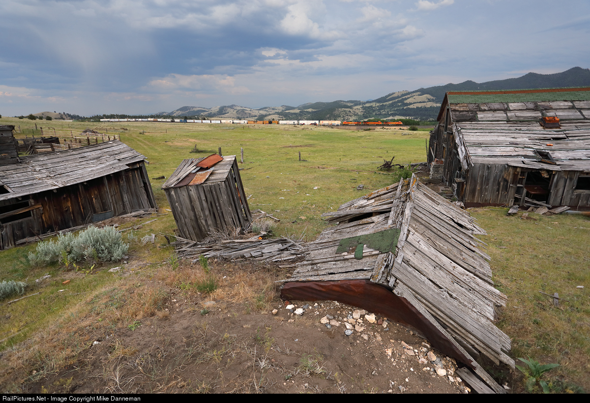 An eastbound BNSF manifest freight train drops downgrade on Montana Rail Link’s crossing of Mullan Pass, passing a long abandoned homestead and ranch, as it approaches Austin, Montana, on July 4, 2021.