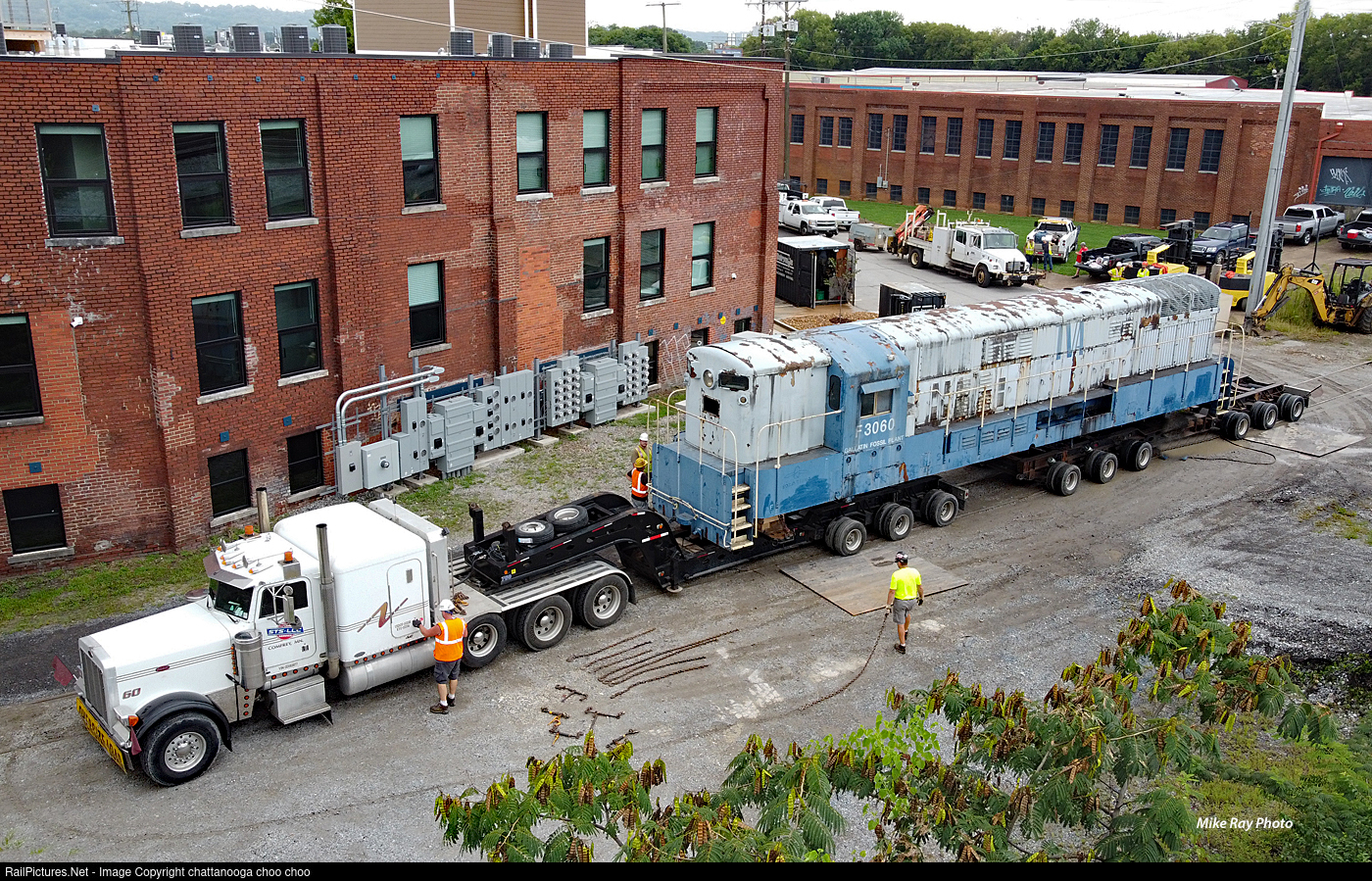 Donated TVA Train Master arrives at Chattanooga Tn for unloading , its new home is the Tennessee Valley RR Museum.