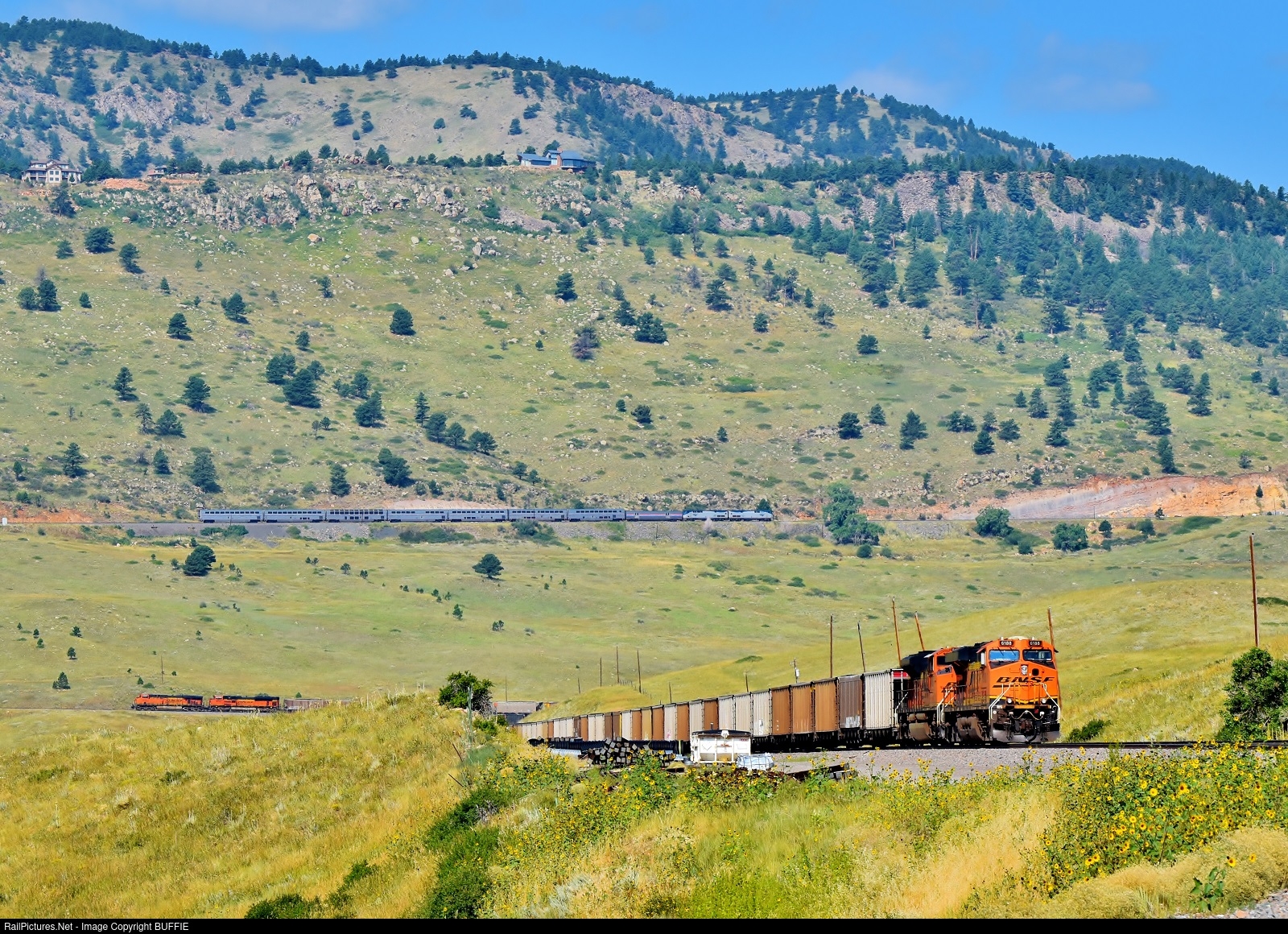 The California Zephyr runs west on the high ridge at Eisele while a BNSF coal train waits for a crew at Rocky, Colorado.