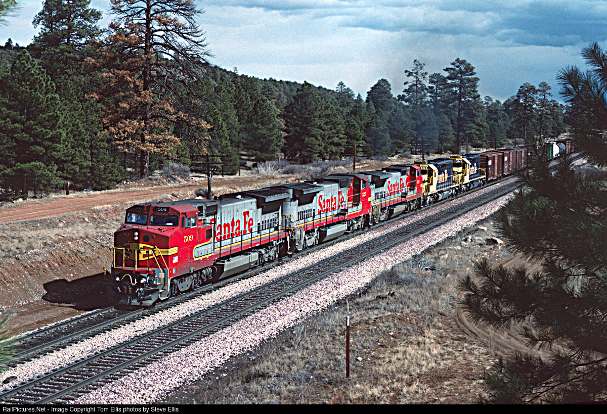 The latest and greatest B40-8W 509, 527, 525, lead two old veterans SD40's 5024, 5045. Heading westbound on the eastside of Flagstaff, Arizona (Tom Ellis photo.)