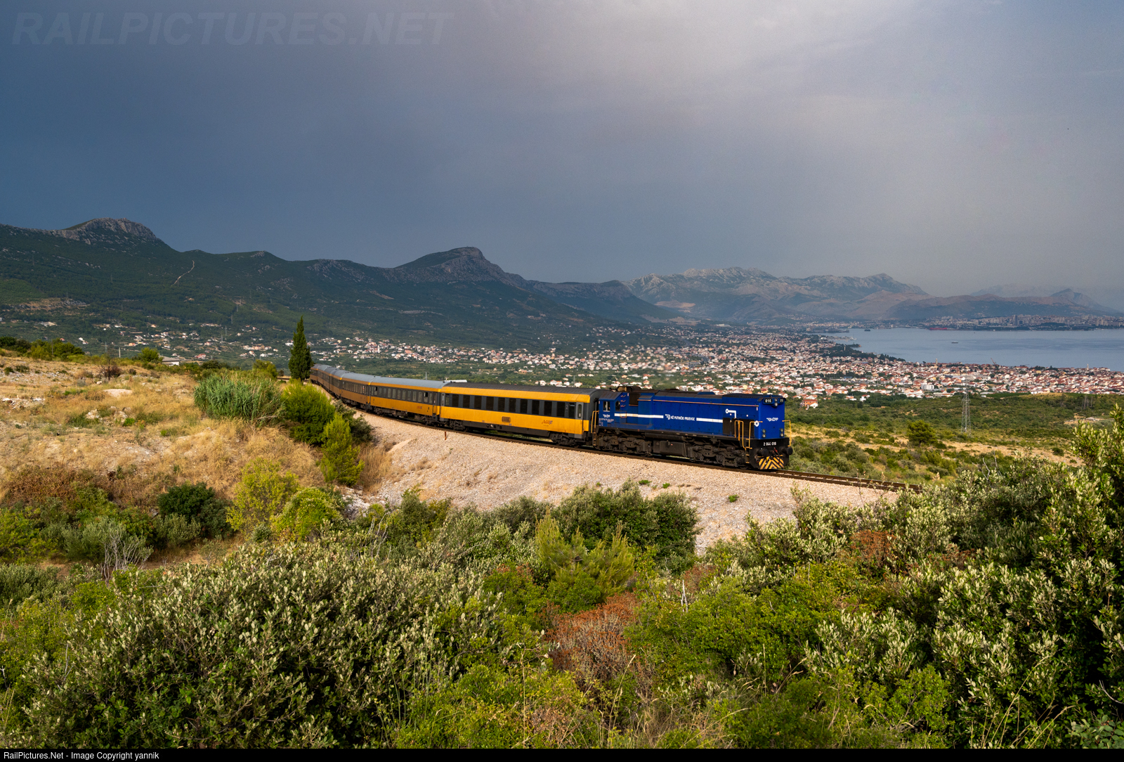| In the day's last sunlight, a dark blue General Motors diesel engine has begun climbing up the steep incline towards Perkovi? with the RegioJet 1046 from Split to Praha hl. n. In the background, a thunderstorm started rolling over the harbor city Split and gives this moment something mysterious. |