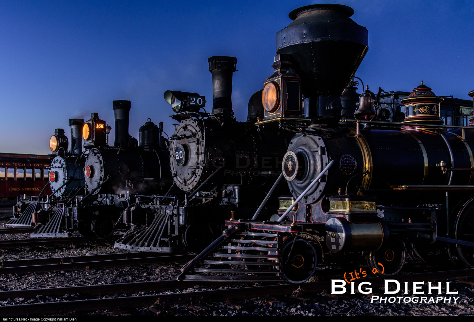 From Right to Left, Eureka and Palisade #4 (1875), Florence and Cripple Creek/Rio Grande Southern 4-6-0 #20 (1899), D&RG/D&RGW 168, and Florence and Cripple Creek/D&RG 425 (aka, D&RGW 315)