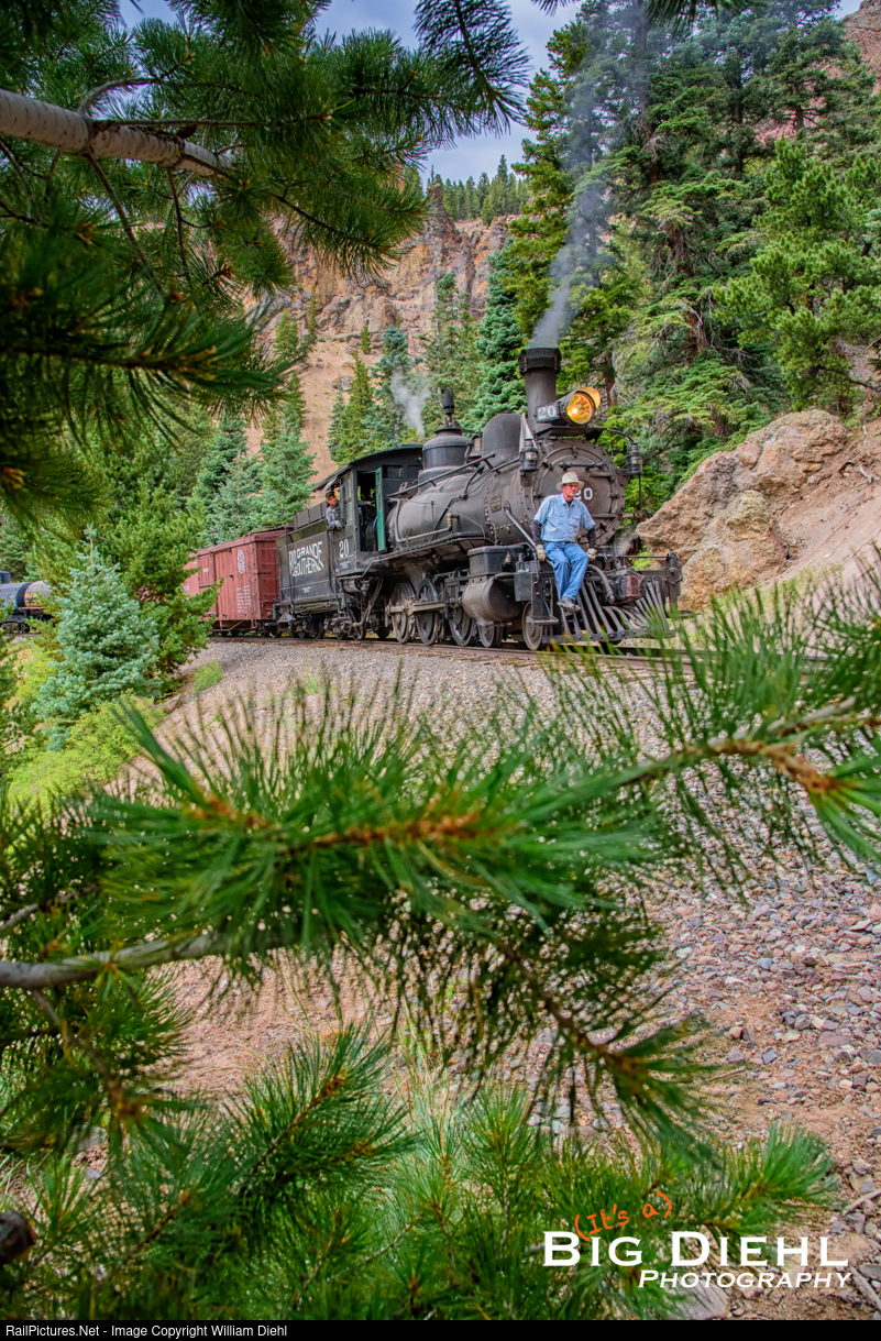 Re-creating an iconic photo that graced the front cover to Trains Magazine in 1942, the newly restored Rio Grande Southern 4-6-0 No. 20 poses as a brakeman sits on the pilot to re-create that cover. The brakeman that was was riding the pilot to help keep an eye out for landslides that plagued the famed railroad. Today, there's not a problem on the Cumbres and Toltec, but we stopped to take this static shot. From the cab, you can see the Cumbres' long tenured engineer, Carlos Llamas at the throttle..