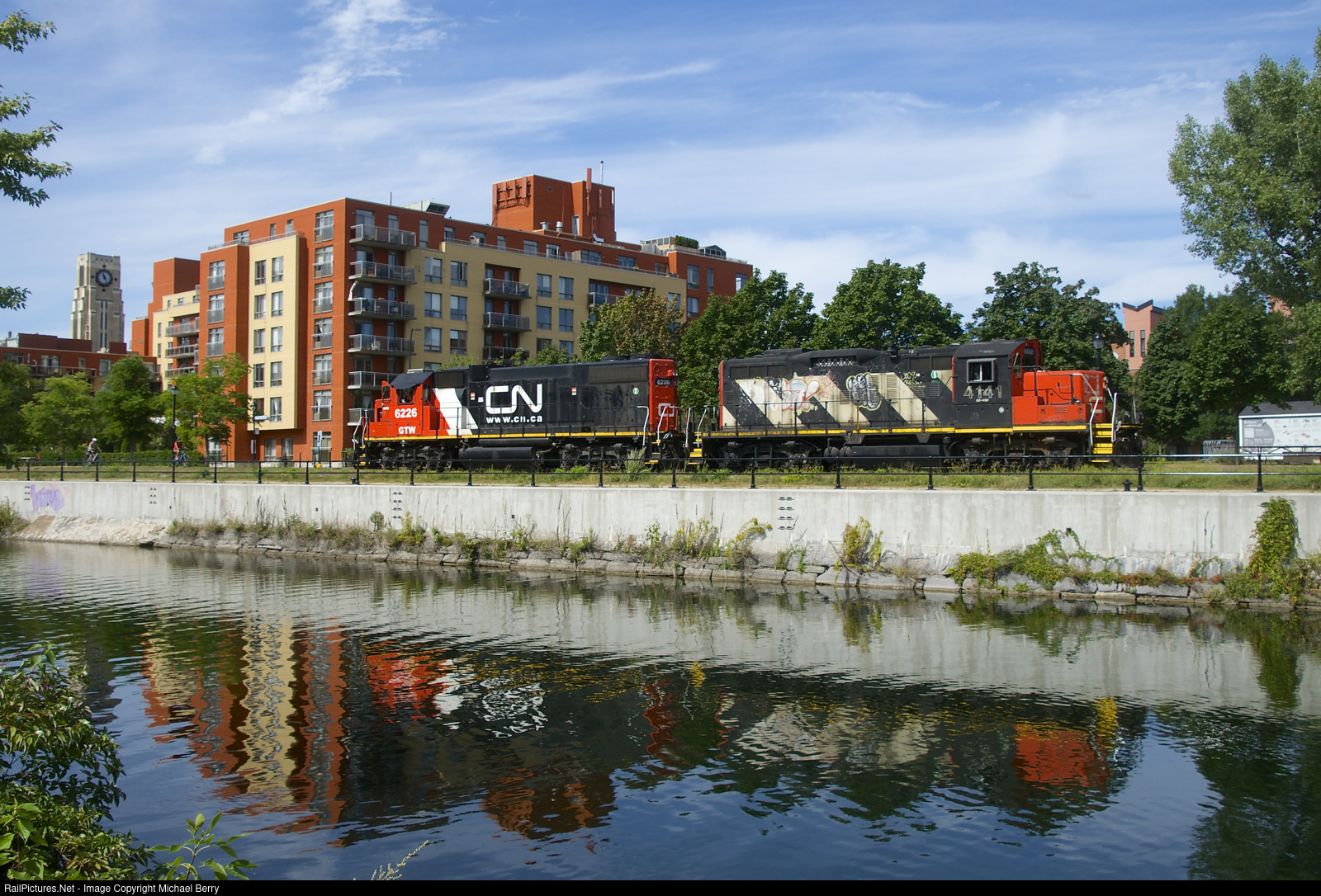 | GTW 6262 & CN 4141 are casting a bit of a reflection in the Lachine Canal as they head back to the main line after dropping off six grain cars at Ardent Mills. At far left is the Atwater Market tower. The Atwater Market opened in 1933 and is still a popular location for purchasing fresh foods. |