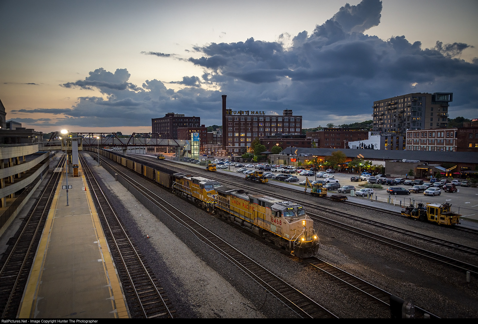 | Just minutes after sunset, an eastbound coal train passes Union Station in Kansas City, MO on August 30, 2021. |