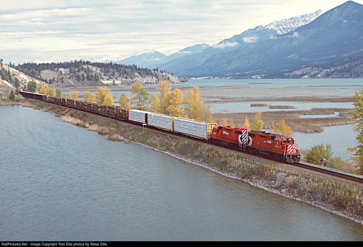| One of those shot you see, and want to get yourself. But living in Utah it's easier said than done. I tried it with my dad in 1999 and we struck out. A secondary line that has a few coal trains and a little local traffic. My dad did pull off the Canal Flats shot in October of 1995. A Canadian Pacific local with two GP38-2's 3107, and 3050. (Tom Ellis photo) |