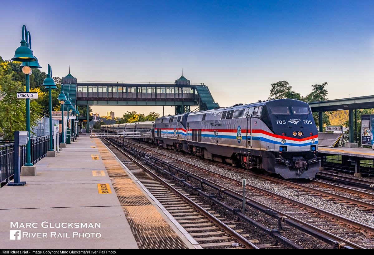 Bridge Plates Are Out, Service Is Back. On the morning of Tuesday, September 7, 2021, Amtrak Train 63 (AMTK 705, P32AC-DM leading) was the first Empire Service departure from New York's Penn Station since service was suspended on the night of Wednesday, September 1, 2021 due to the effects of Hurricane/Tropical Storm Ida, seen passing through the Greystone Station in Yonkers, New York. MTA Metro-North Railroad has fully reopened 2 of the 4 tracks on the Hudson Line and is employing bridge plates at the effected stations to allow passengers to safely board on what are usually express tracks. While the typical Empire Service train is 1 engine and 5 cars, this train is double that size to return the balance of equipment to normal order. Metro-North is operating on a modified schedule.