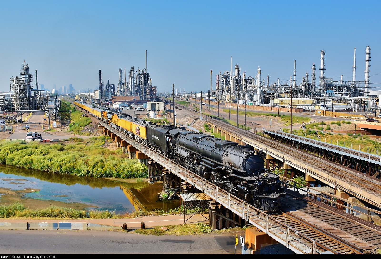 UP Big Boy 4014 leaves Denver behind as it travels north on the Greeley Sub, passing between the refineries of Commerce City.