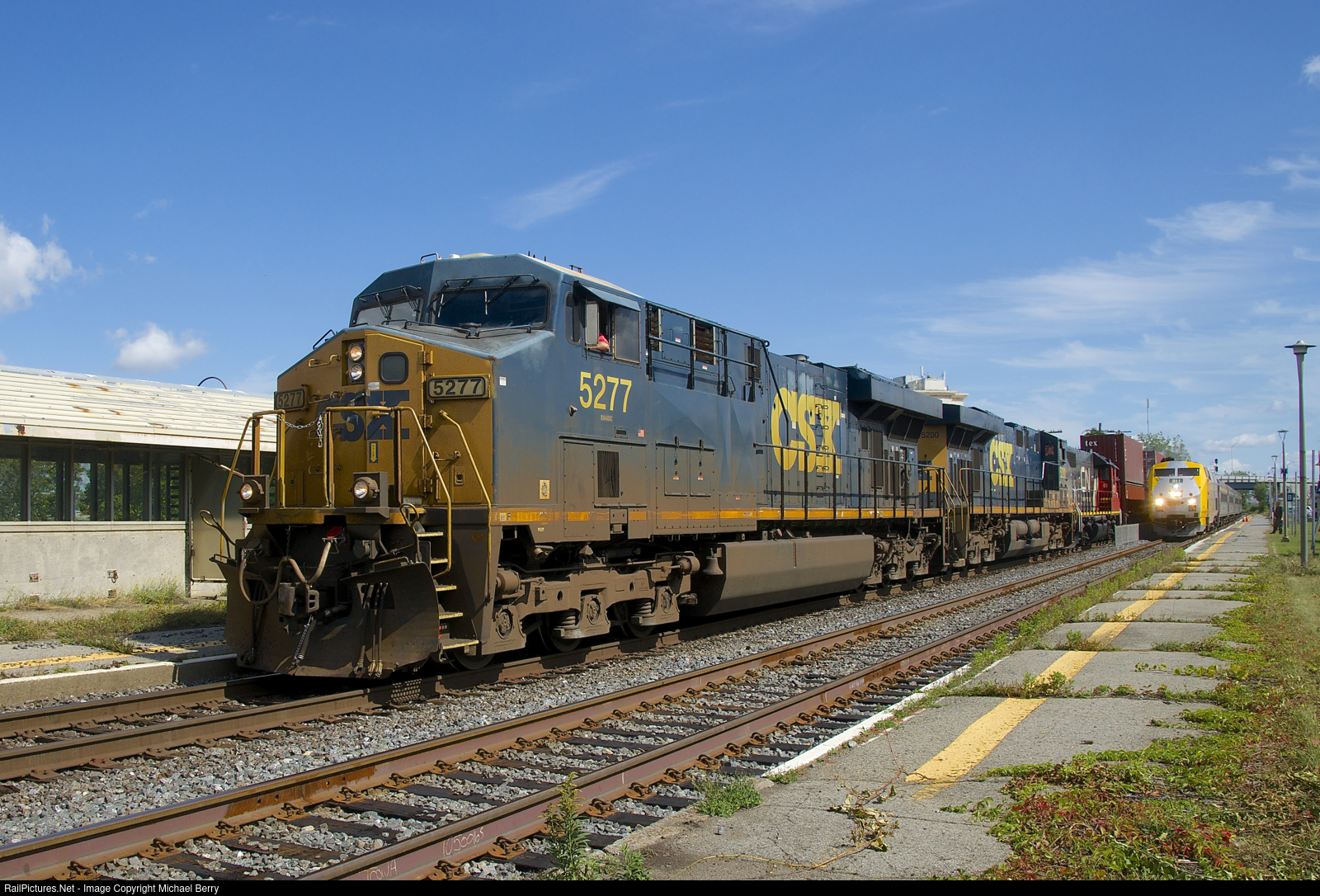 | A short CN 327 with CSXT 5277, CSXT 5200 and CN 4721 for power temporarily passes a stopped VIA 35 at Dorval Station. CN 327 will have to stop just further ahead to let VIA 35 and CN 149 pass before it departs. |