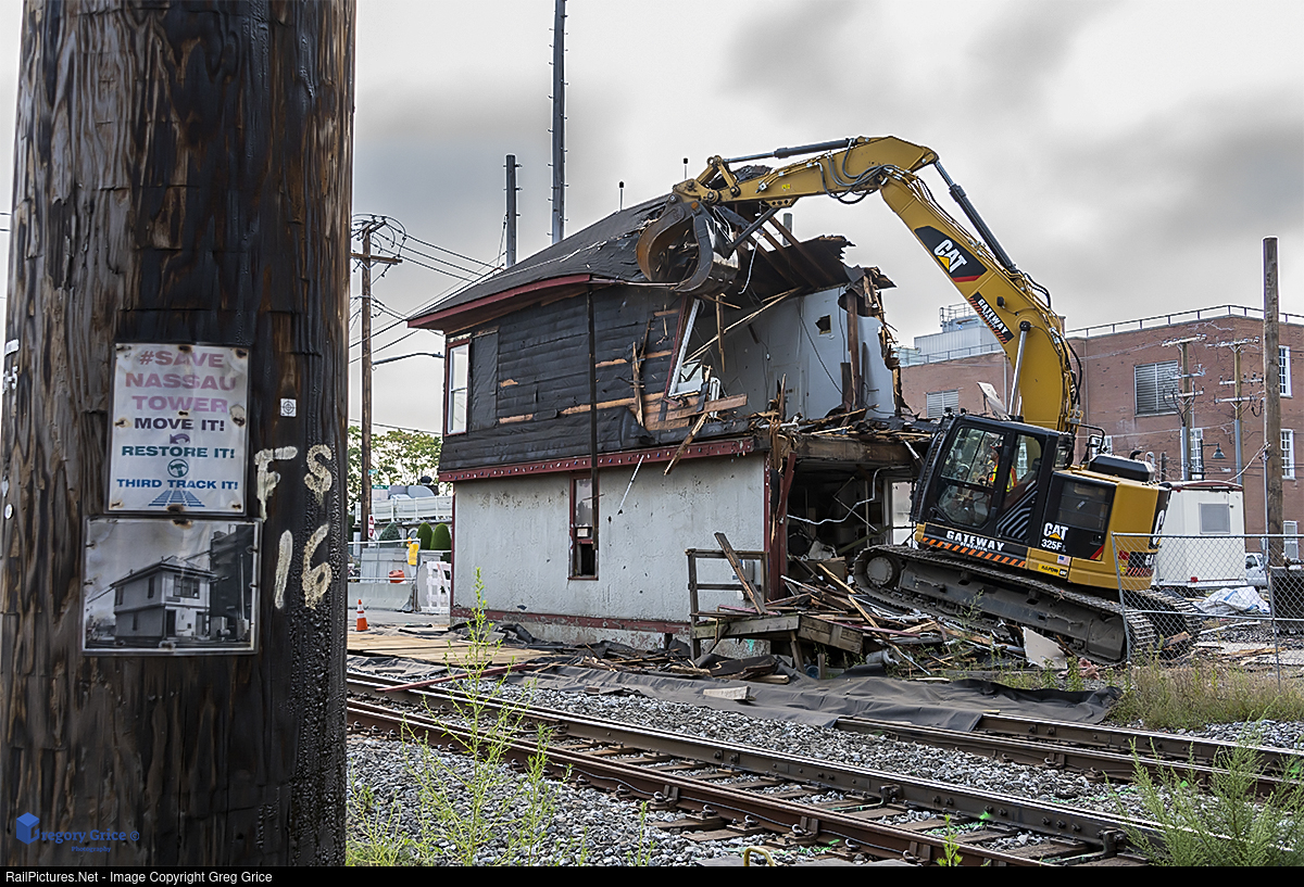 On September 18th, 2021 at 0745hrs, Long Island Rail Road's Nassau Interlocking Tower was demolished after serving the railroad for almost a century. The Gateway Demo/Civil Corporation excavator is already halfway through the tower while posters aiming to save the tower hang on a nearby telephone pole.