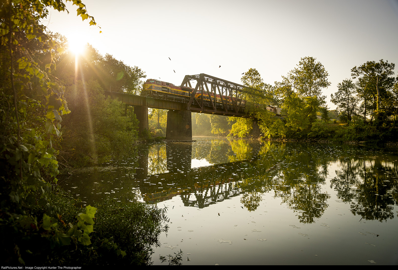 | The sun rises over eastern Oklahoma as a northbound coal train crosses the Illinois River near the community of Watts on a warm September 20, 2021 morning. |