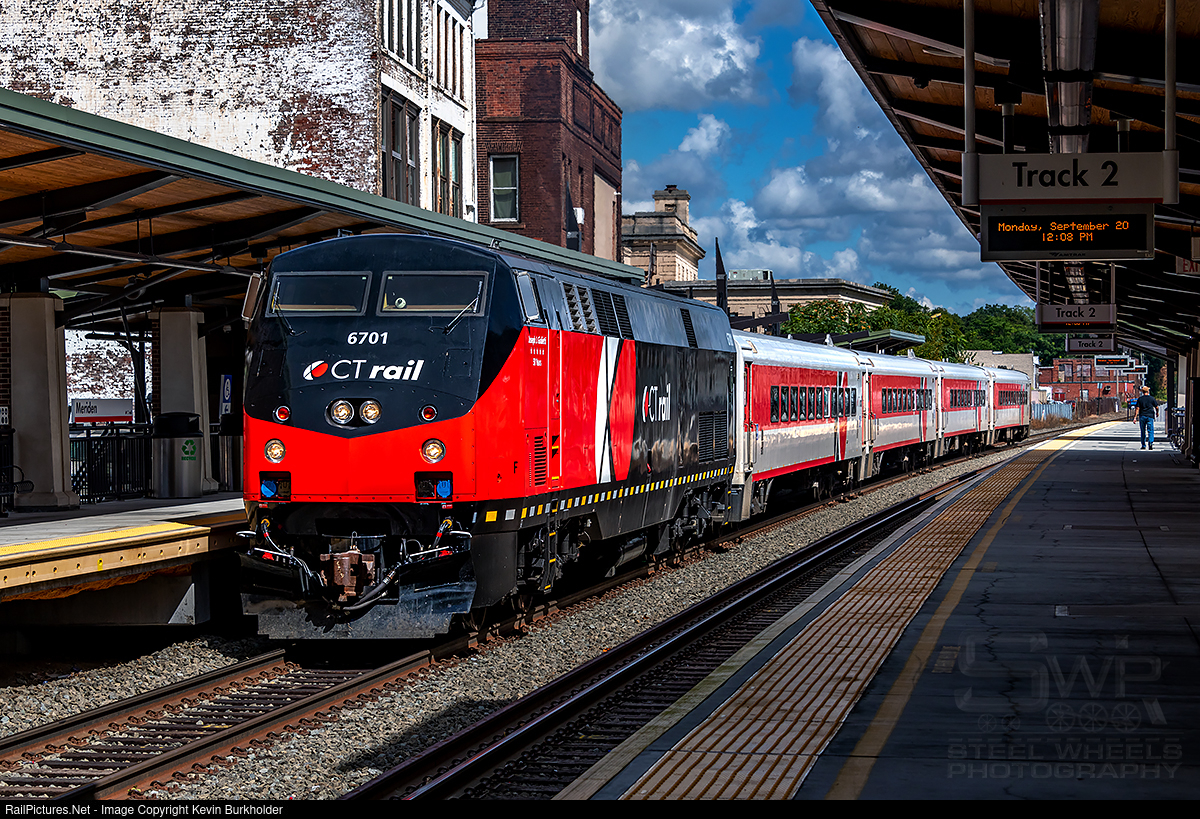 CDOT Acceptance Test Extra 6701 south rolls through the Meriden, CT station with the rebuilt GE P40DC 6701 leading a 4-car train. The 6701 was built as Amtrak P40DC 834 and was recently rebuilt by Amtrak's Beech Grove shops and decked out in the Coke Zero scheme of the CT Rail affiliate of CDOT.