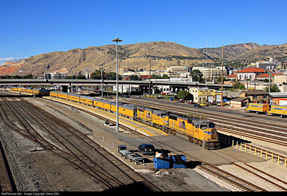 | This Union Pacific officer special came into Salt Lake on the 19th, and is supposed to head out on the 21st. Word on the street is it's heading to Denver. I fired off a shot from one of the overpasses this afternoon of the 4533 and 3001. The Rio Grande depot, and the Utah State Capital can be seen in the back ground. |