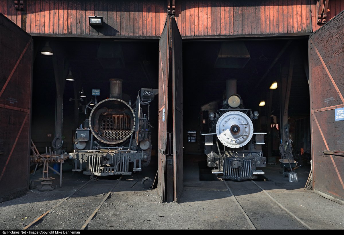 Former Rio Grande K-36 Mikado No. 482 is getting an overhaul at the Durango & Silverton Narrow Gauge Railroad’s roundhouse and shop at Durango, Colorado, on August 30, 2021. In the stall next to the 2-8-2 is the “Slim Princess,” Southern Pacific narrow gauge 4-6-0 No. 18 that is being leased in 2021 from the Eastern California Museum in Independence, California. As an oil burner, it was also used to train crews on the D&SNG on oil-firing a locomotive in 2018-2019. Since that time, the railroad has done a total rebuild of K-37 No. 493, converting it, as well as K-36 No. 480 and K-28 No. 473, to burn oil. As part of its overhaul, No. 482 will also be converted to an oil burner.