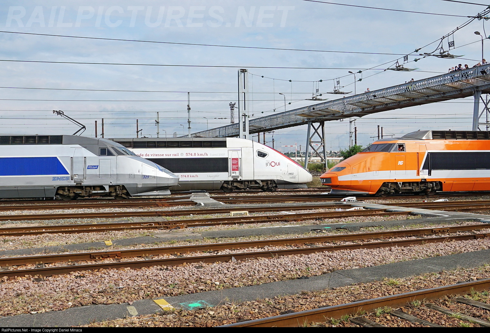 TGV: 40 YEARS - 3 kinds of high speed trains, the chassis are very similar but nose have different forms between generations and can be easier compared... Special celebration at Villeneuve Saint-Georges depot to celebrate the 40 years anniversary of official commercial TGV service in France. That's the first time that all France High speed world record TGV trainsets are exposed together: First, the Orange TGV SE #16 which have reach 380 Kph the the 26 February 1981. Second is the TGV A #325 which have reach 515,3 Kph the 18 May 1990. Third, is the TGV POS #4402 which have reach 574,8 Kph the 3 April 2007.
