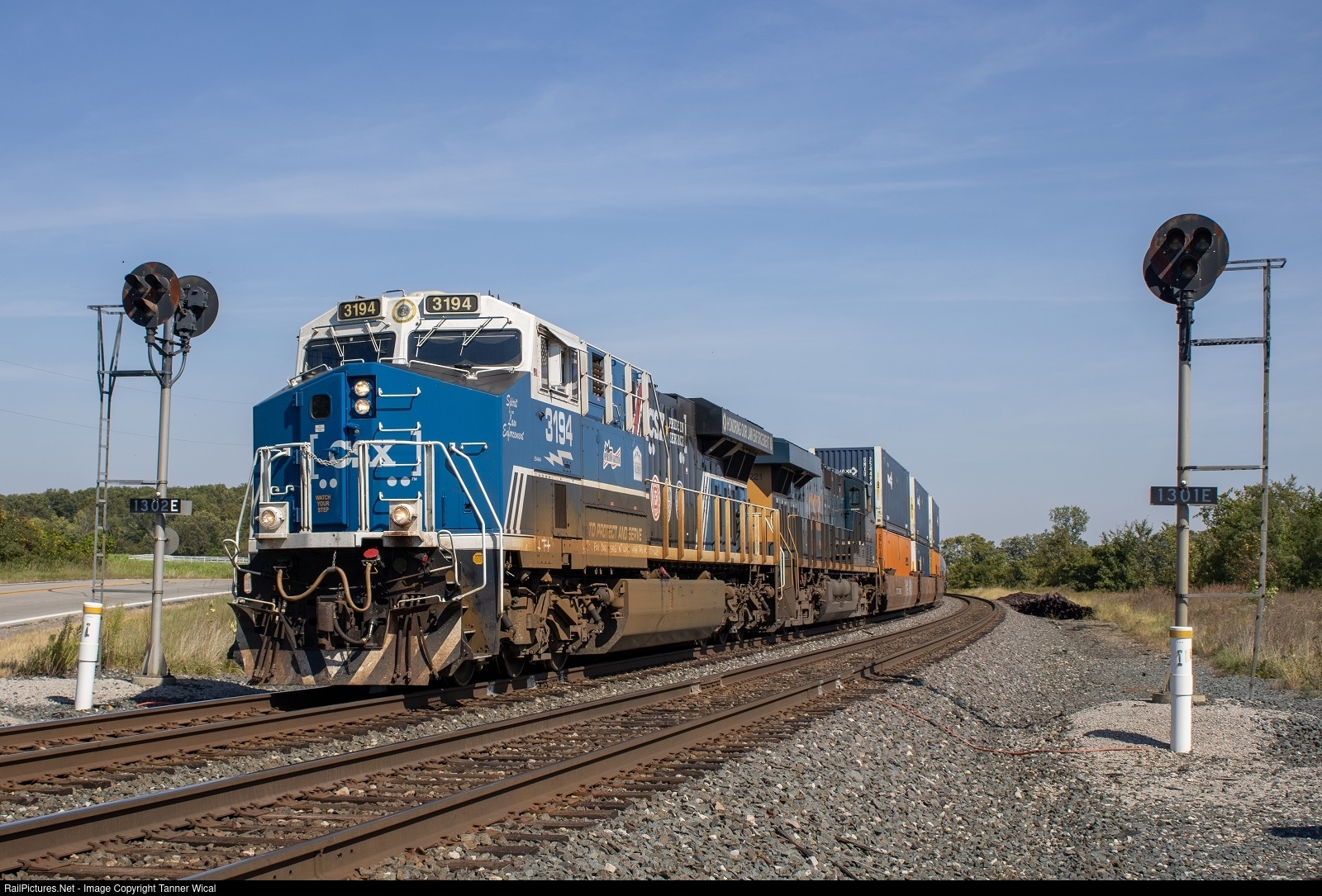 | CSX 3194 is on the point of Q331-26 as it slowly creeps through the intermediate signals at QI 130 along CSX's Mt Victory Subdivision. In the over two years since the first Price in Service unit has been released, this was the first one to make the run across the Mt. Victory Subdivision. |