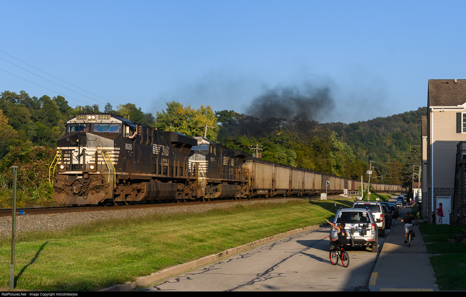 The conductor of a loaded NS coal train exchanges a wave with a couple local kids as they ride home after coming to check out the photographer's drone. The train is heading north through California, Pennsylvania on the Mon Line towards Shire Oaks Yard where they will tie down.