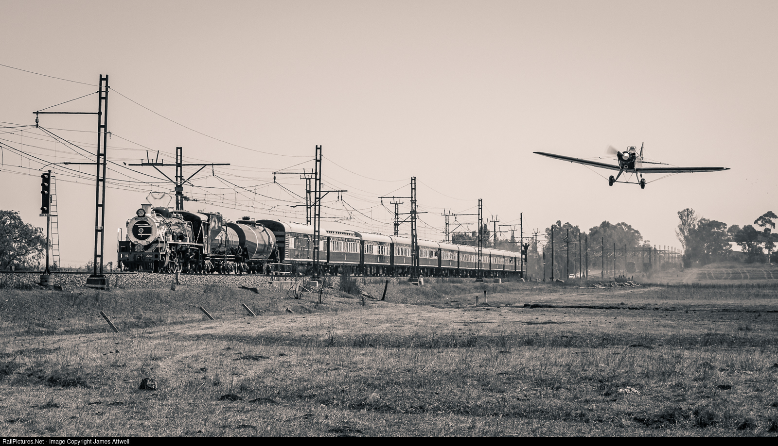 'Fly-b(ab)y!' Class 19D No.3360 and the 'Great Train Race' are on the main between Driemanskap and Heidelberg, with a 'Fly Baby' giving a low fly-by for spectators.