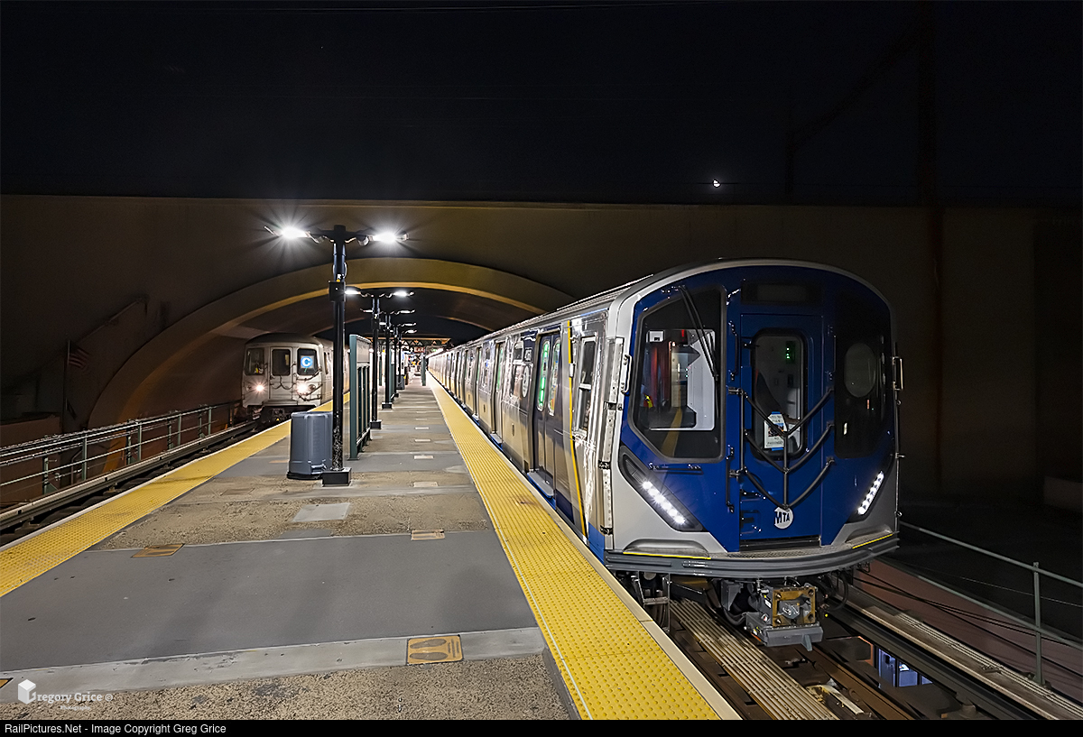 The first Kawasaki built MTA New York City Transit R211A subway cars (4060-4064) and "protect train" consisting of Pullman Standard R46 series cars (signed up as a "C" train) sit side by side on the platform at Astoria-Ditmars Blvd while performing clearance testing on the BMT Astoria Line during the early morning hours of September 28th, 2021.