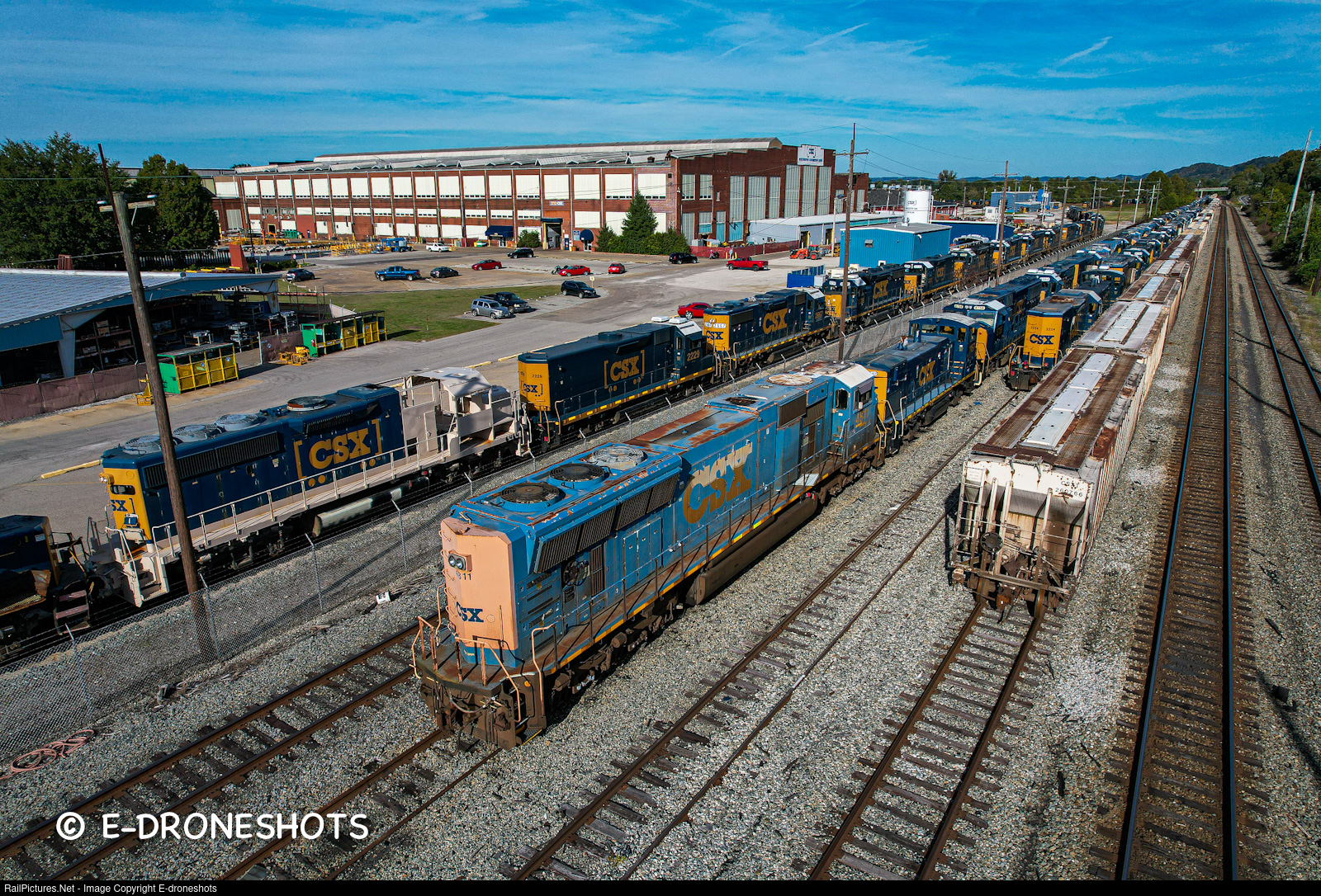 A gathering of several locomotives is seen here at the CSX Huntington locomotive shop. Several locomotives are in storage while others are in the process of being rebuilt.