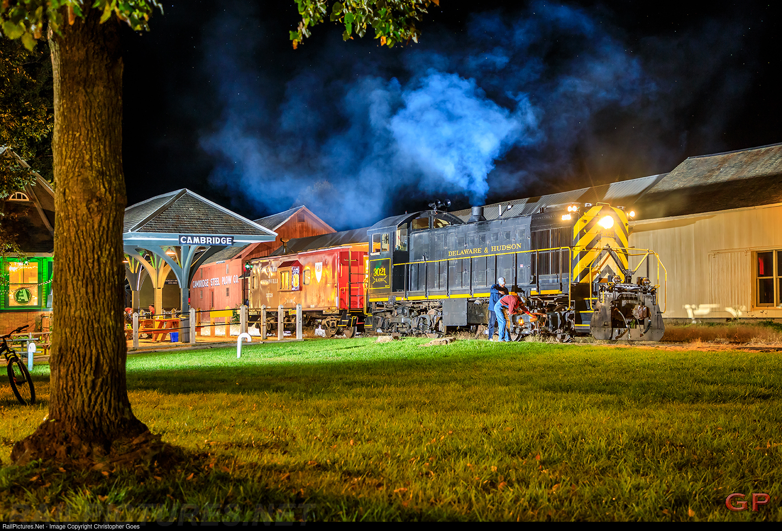As part of a fundraising event with NE-Rail in part by Raven Rail LLC & well known night rail-photographer William Gill, lighting was setup at the former D&H Cambridge Station on the Batten Kill Railroad Friday evening for a night photo-shoot w/ Hal Raven's D&H 3021 (former US Army ALCO S2) & restored G&J Caboose outside the station also highlighting the historical buildings that still remain.