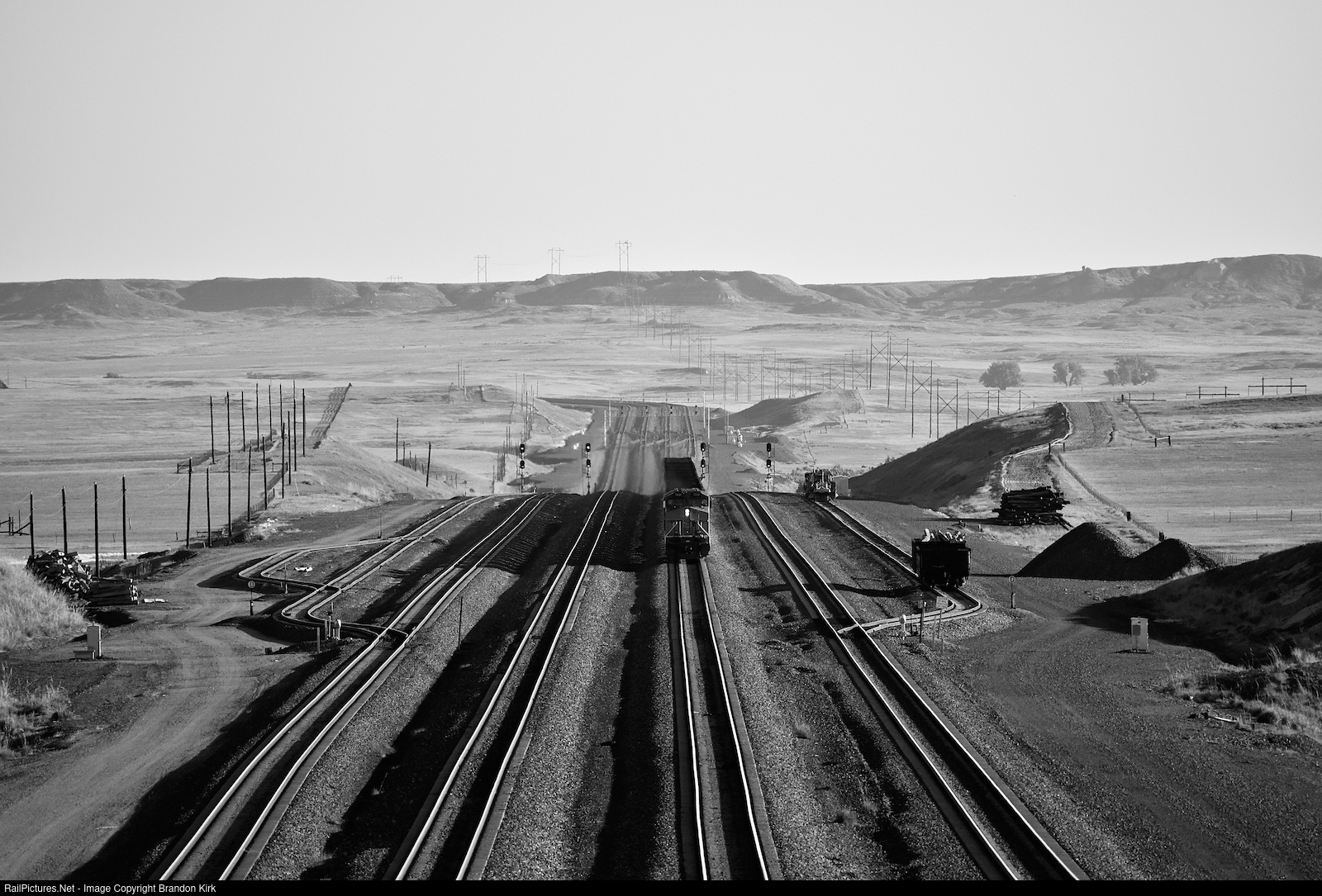 | Quickly moving through the Powder River Basin with empties, this Union Pacific train rolls over Logan Hill heading for more loads with two UP DPUs on the rear. |