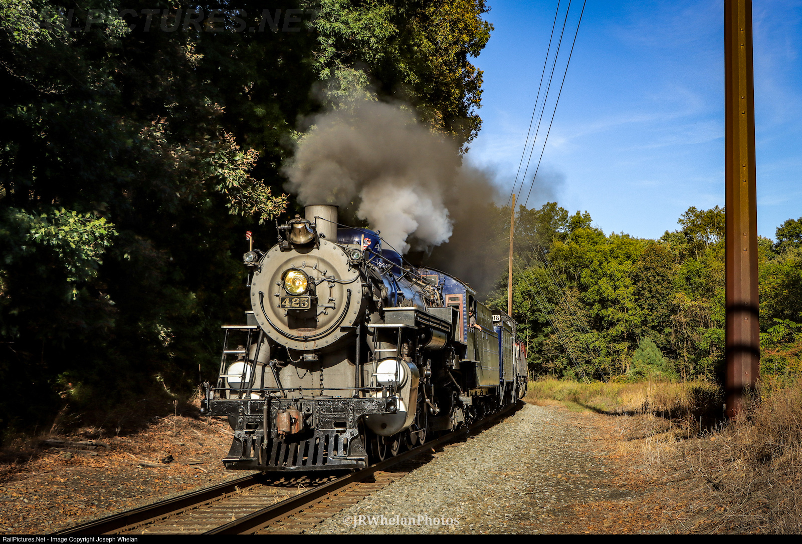 | After cresting the grade and heading south through Tamaqua, Reading & Northern 425's leads a Fall Foliage Excursion downhill through Reynolds. |