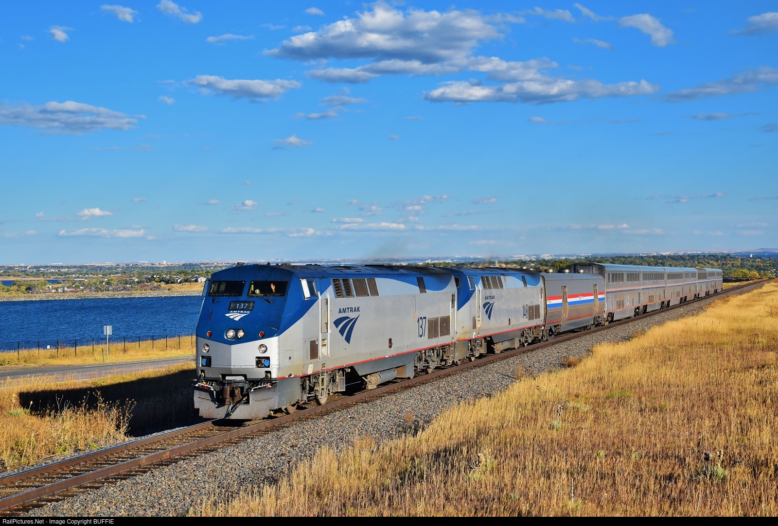 | A friendly wave from the conductor greets the photographer as AMTK 137 (P42DC) runs through Arvada, Colorado on its way to the Moffat Tunnel in the Colorado Rocky Mountains. |
