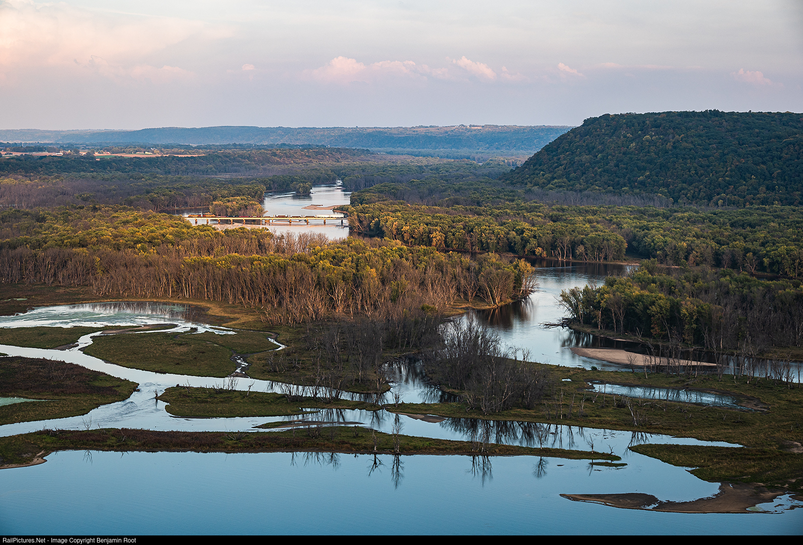 An EB BNSF manifest crosses the Wisconsin River, just upstream from the mighty Mississippi River. The photo was taken from an outlook at Pikes Peak State Park.