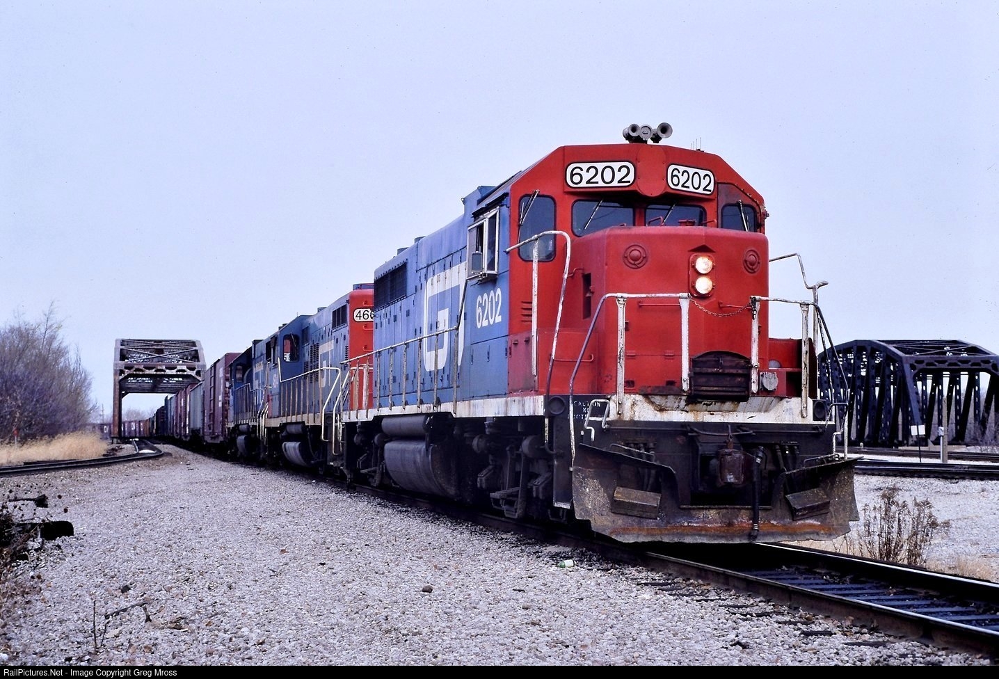 GT 6202 (ex-DT&I 202) brightens a gloomy day as it brings a transfer thru Blue Island, IL in November of 1990. Hard to believe this was 31 years ago.....