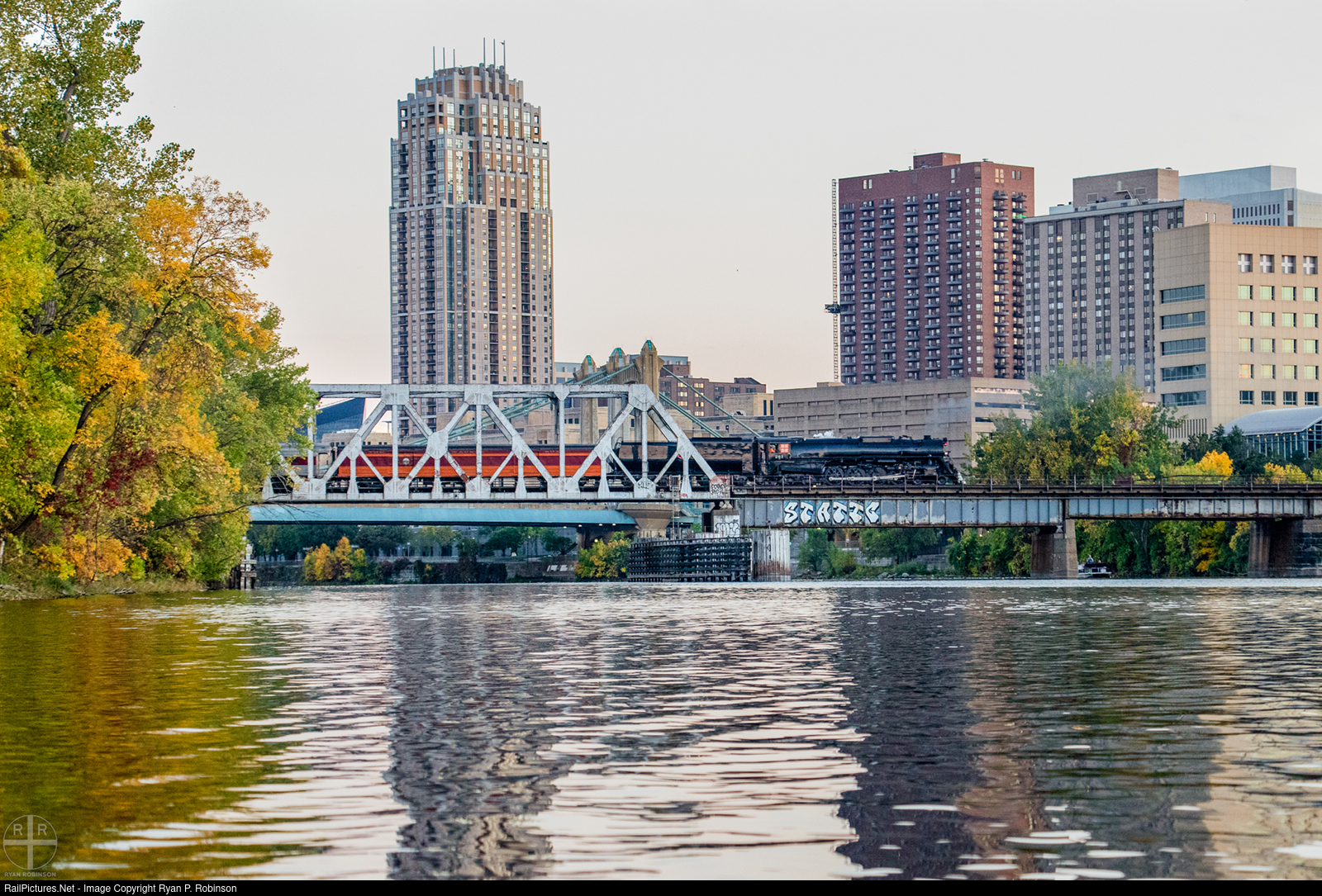| After a successful weekend of running tips out of the Twin Cities, Milwaukee Road 261 crosses over the Mississippi River in downtown Minneapolis on their way back to their home shop. |