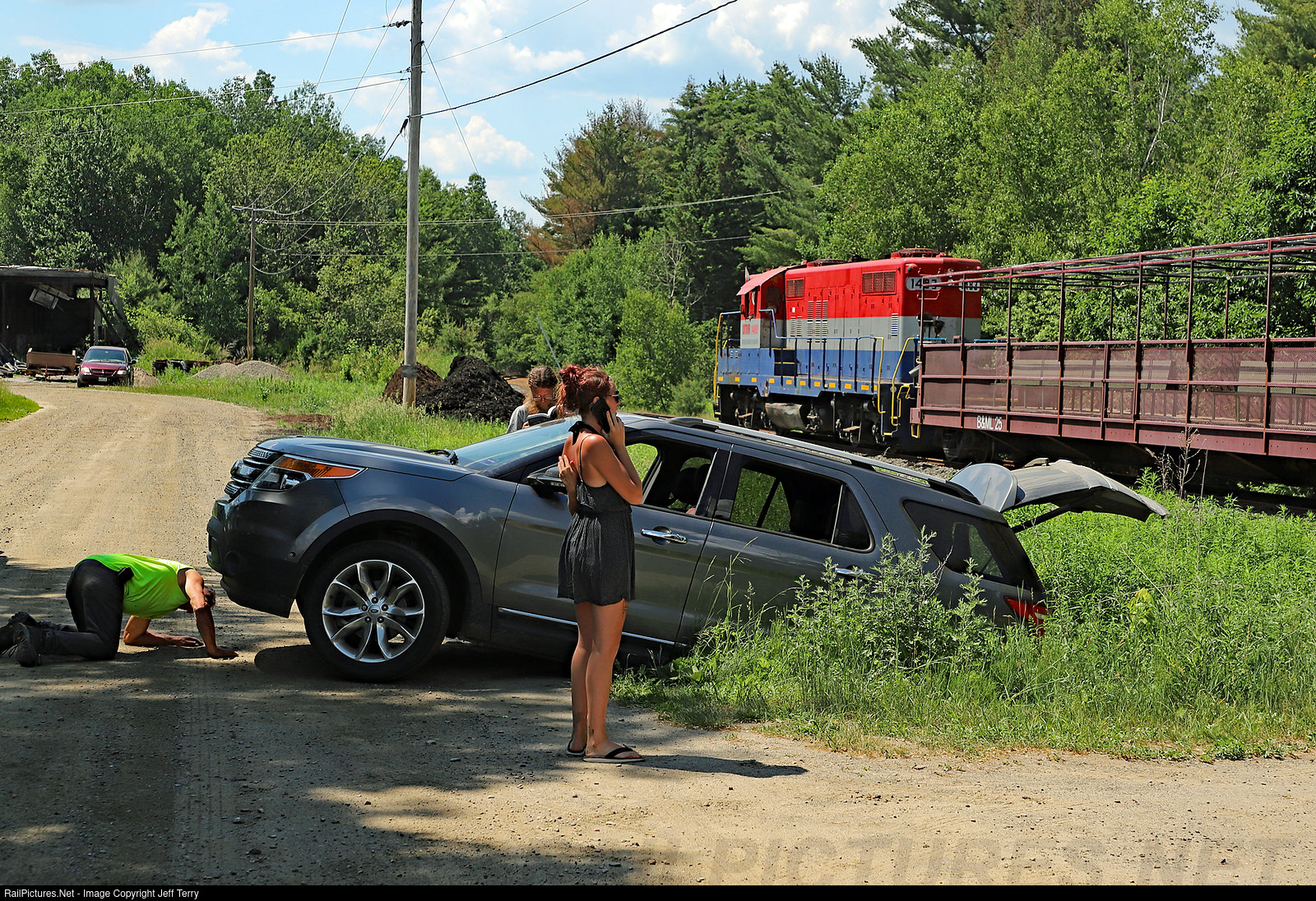 | Oops! Tow trucks are being called as the Belfast & Moosehead Lake excursion train heads towards Unity Pond, Maine. This incident was in no way caused by the train. Be careful turning around on narrow dirt roads, folks! |