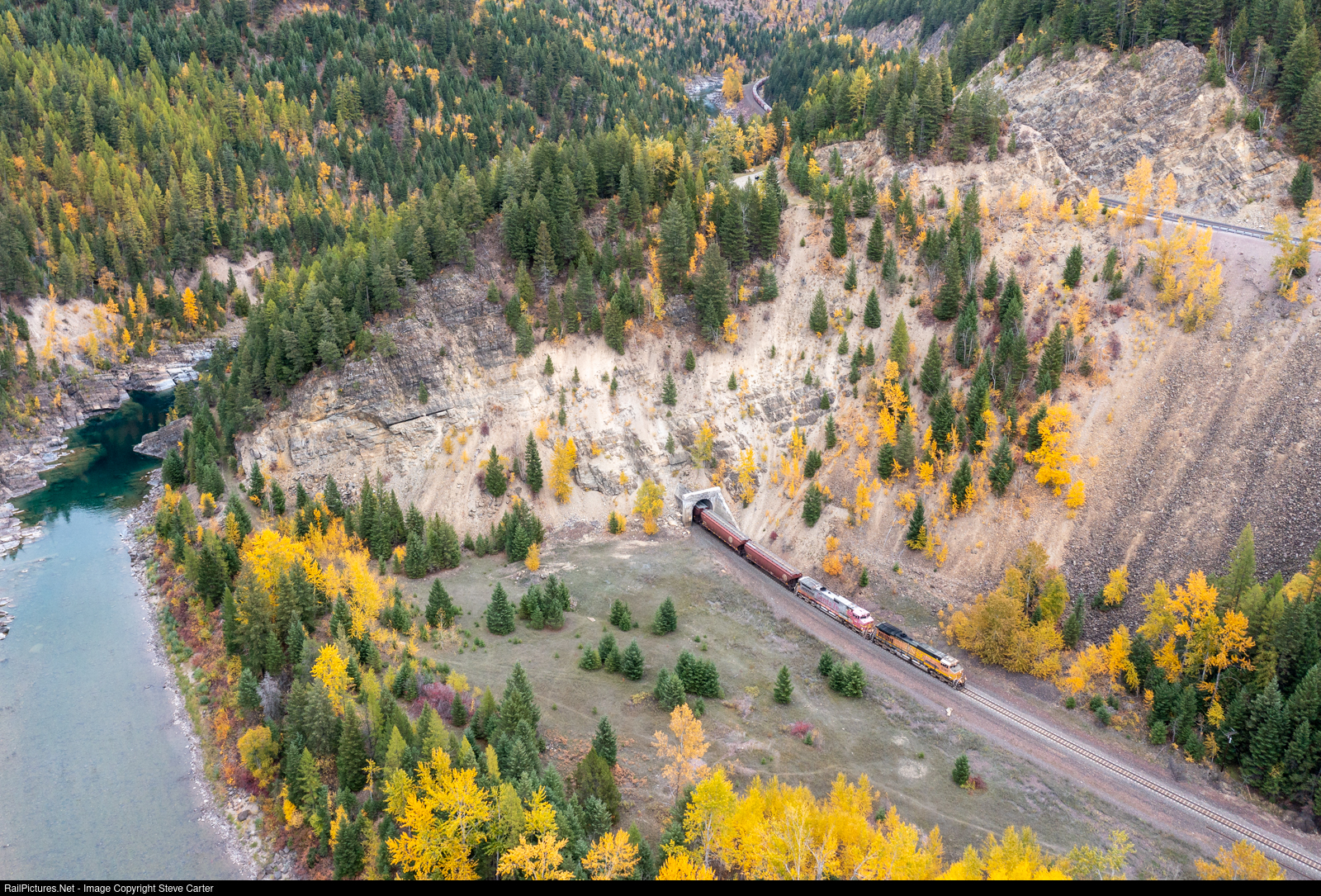 | Along the Middle Fork of the Flathead River flows midwestern grain bound for the terminals on the west coast. Here at one of a string of tunnels, a pair of faded bonnets are in charge of another grain train. Their fading colors stand in stark contrast to the fall colors on the trees, which are just about at their grandest. |