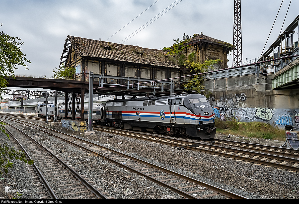 On the afternoon of October 13th, 2021, Amtrak P32AC-DM #705, leads an ACSES Test Train eastbound under the abandoned NYW&B Westchester Ave Station on Amtrak's Hell Gate Line.