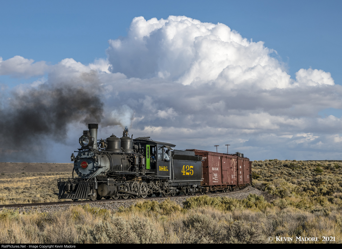 Drifting into Colorado. With massive building cumulus clouds as a backdrop, D&RG Locomotive #425 drifts downgrade at MP 287.4, as she slowly descends off the lava-capped mesa a little over 6 miles southwest of Antonito, Colorado. Although the train is technically headed "railroad east", it is really running compass north at this location, soaking up the broadside afternoon sun.