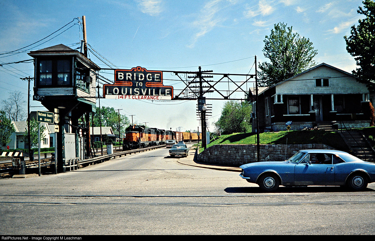 A northbound Milwaukee Road trackage rights train has just come off the K&I Bridge from Louisville and is about to split the streets of New Albany, Indiana at the intersection of Vincennes and E Main. This train will traverse the south end of the Monon to Bedford, Indiana where it will rejoin home rails onto Chicago. Of note in this photo are the rails of the PRR branch from Jeffersonville, IN to New Albany, which was removed in 1973, still embedded in the pavement of E Main Street. All of this chaos, which featured the PRR, Southern Rwy, B&O, Monon, and Milwaukee Road all crossing each other at grade on two separate diamonds buried in the pavement of this busy roadway intersection, was controlled by the operator at VI Tower, which can be seen standing imposingly over the frenetic scene.