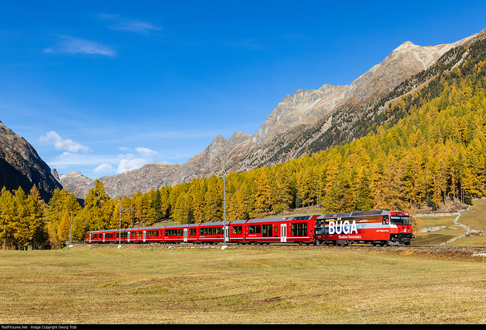 | Ge 4/4 III # 646 of the Rhaetian Railway, in the publicity paint scheme for the BÜGA (grison global ticket), is pullng teh Interregio 1121 from Chur to St.Moritz through the Bever valley. |