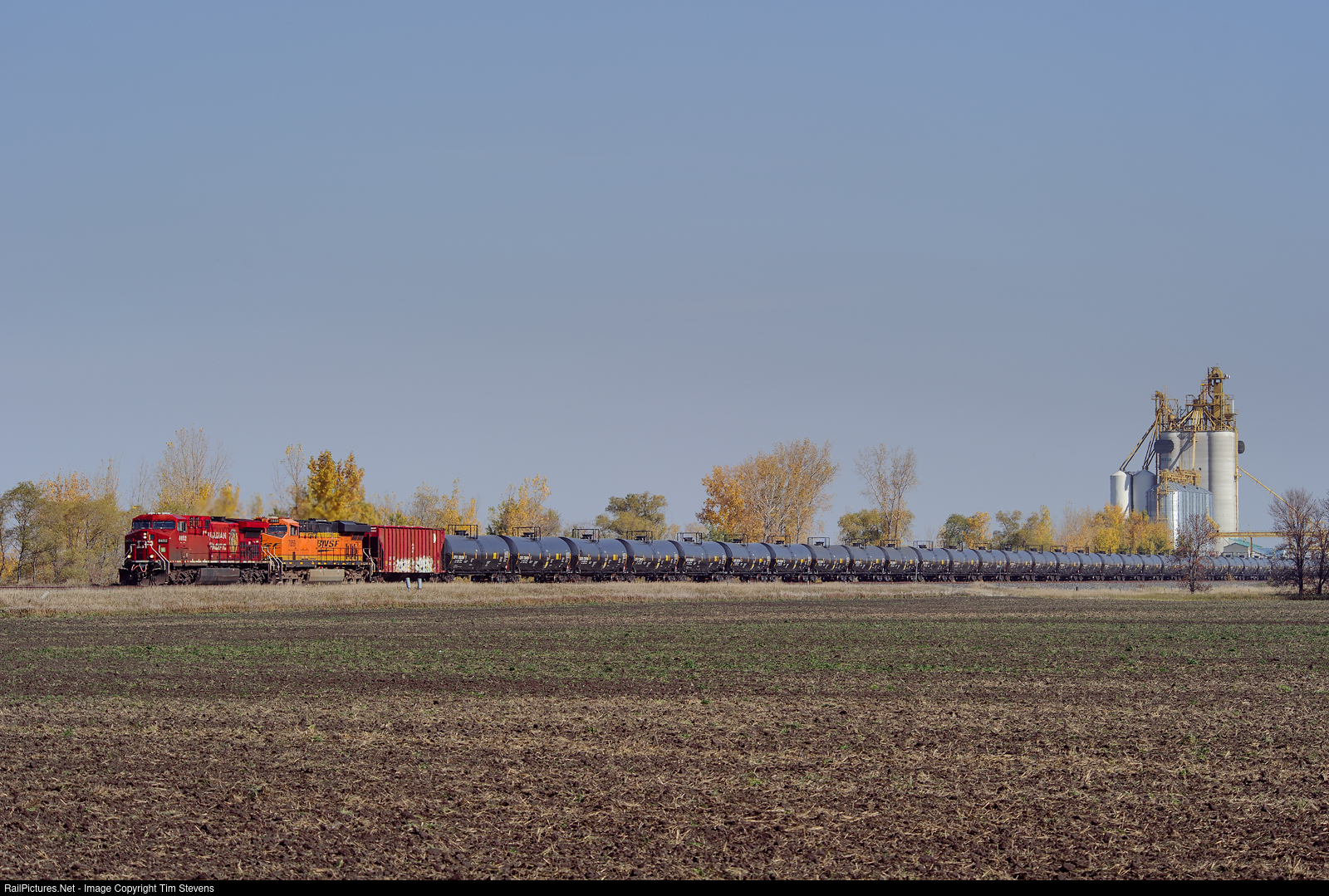 CP AC4400CW 8652 and BNSF ES44DC 7859 lead empty crude oil train 517-394 west on CP's Carberry Sub at Tucker.